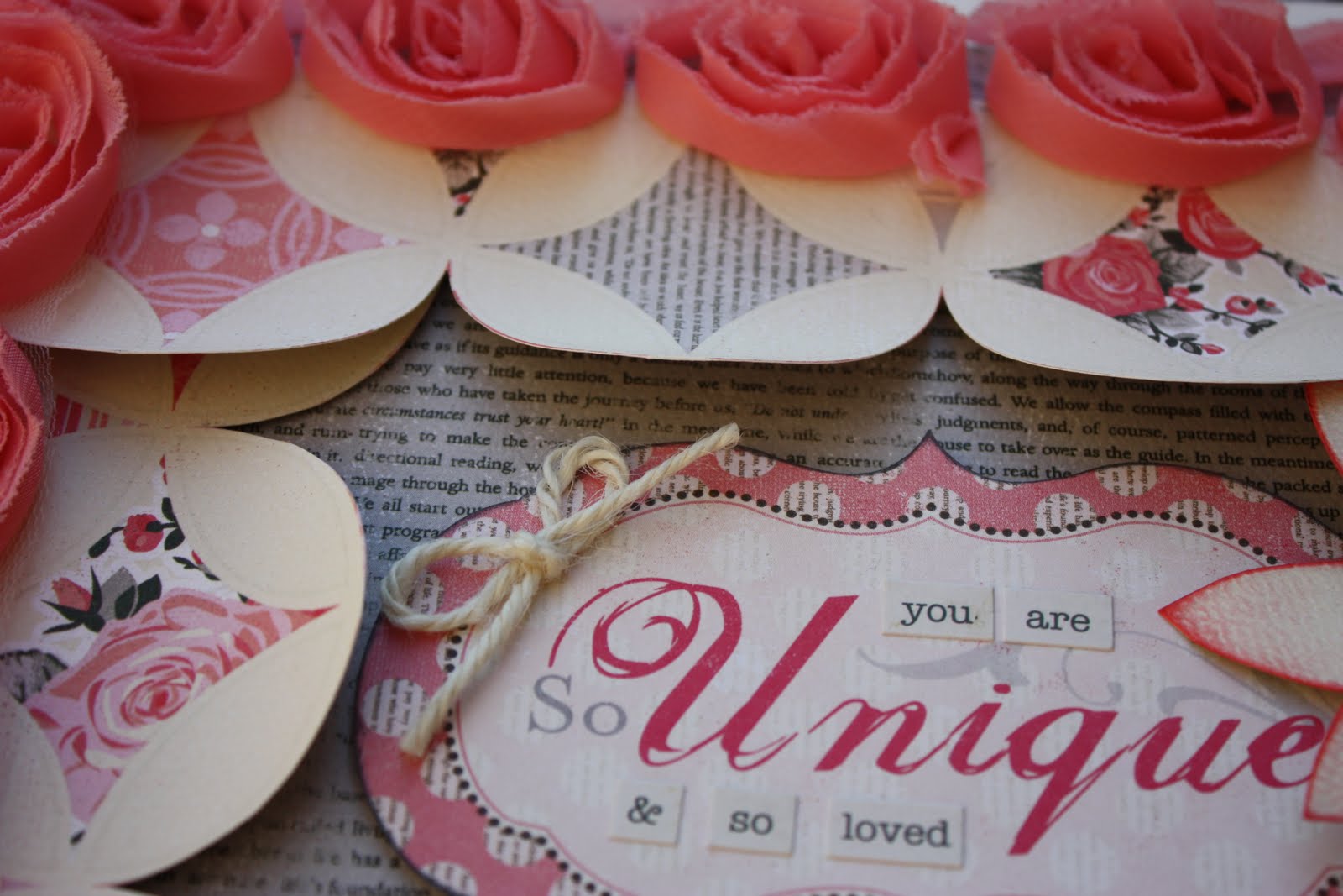 I cut this scalloped edge from one of the patterned papers and used this lovely pink Making Memories ribbon to frame the page….