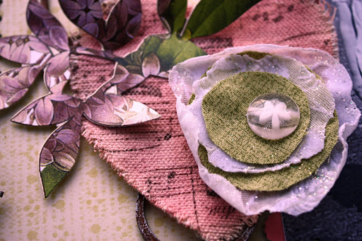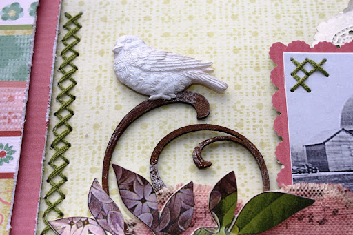 | The patterned leaves is a sticker from Websters, the white resin bird is new Prima. |