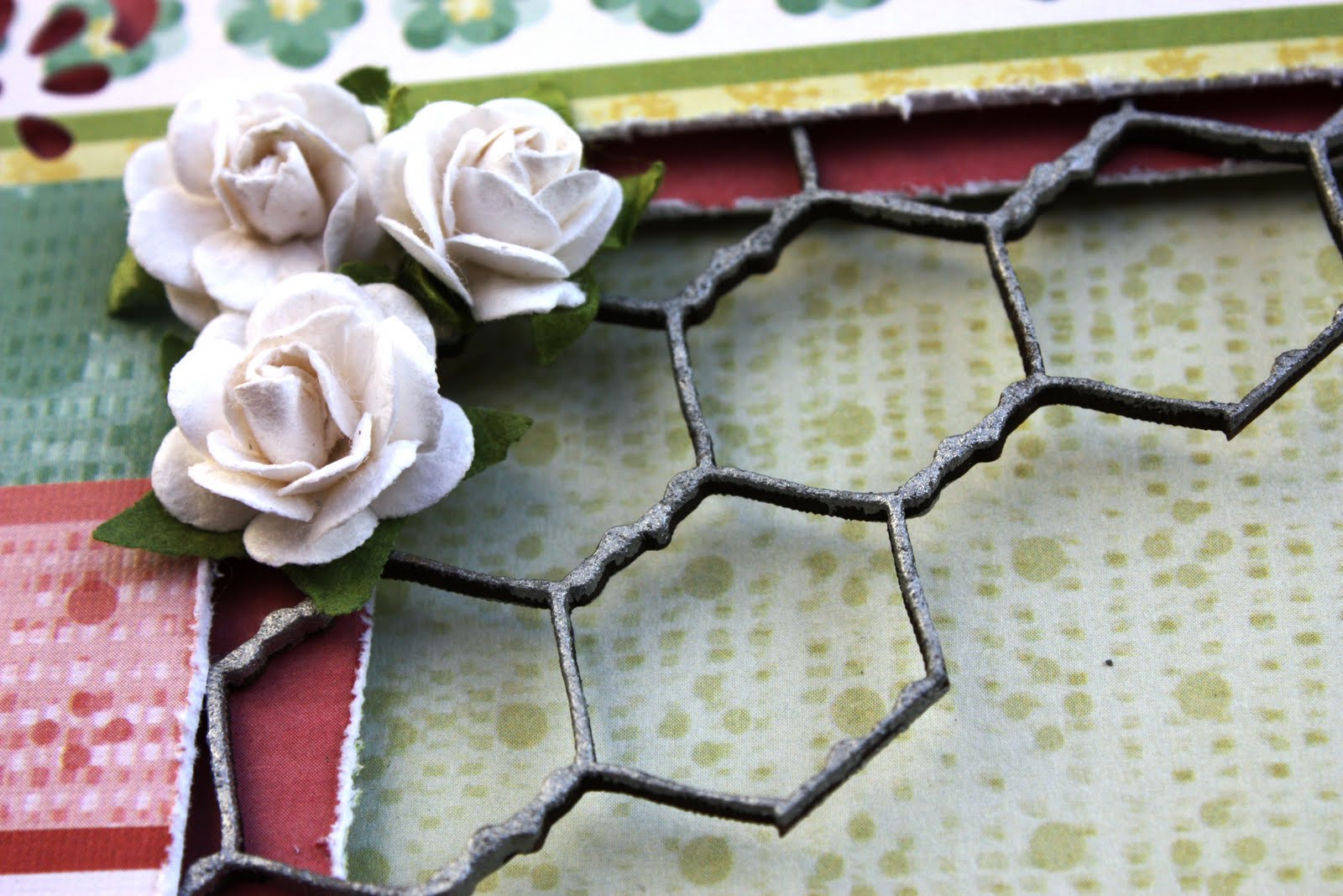 The four corners are punched with a Martha Stewart corner punch. I wanted to do something special inside the shadow box corners so I added chicken wire chipboard (LOVE IT!) from Dusty Attic, which I purchased from Vicky, who has an Etsy shop.
