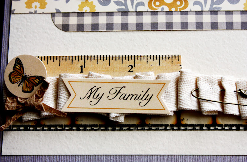 In the Urban monthly kit, you also get a Maya Road vintage ruler, twill ribbon, a piece of Tim Holtz Filmstrip Ribbon and a 7Gypsies antique pin.  The butterfly and “My Family” are stickers from a sticker sheet also included in the kit.