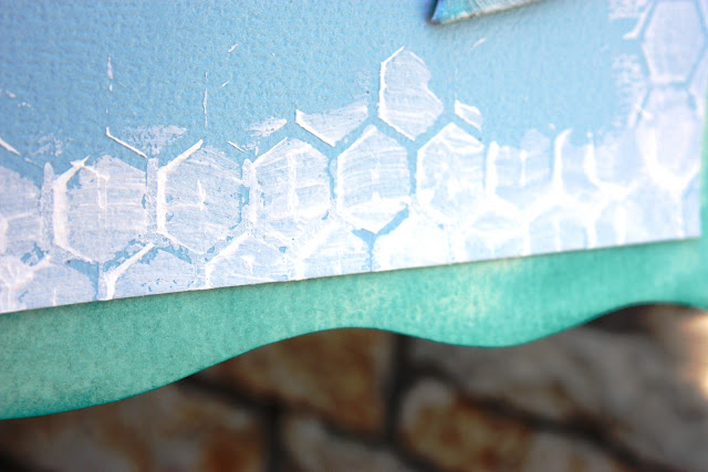 The background base is actually cream cardstock that I inked with Peacock Feathers Distress Ink (new Spring Limited Edition ink), and I wavy cut the bottom edge…