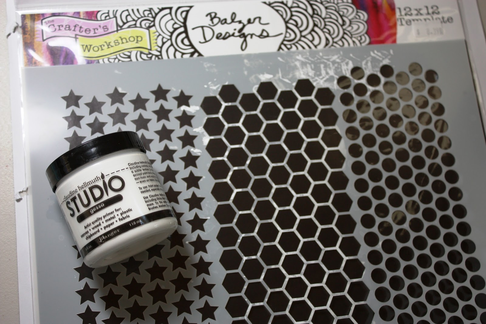 | I used the centre hexagon shaped part of the stencil along the edges of the background and applied the gesso with a paint brush. |