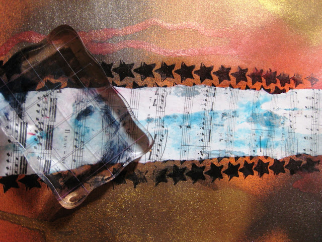 Using Ranger’s Glue N Seal, I adhered a torn piece of Bazzill Antique sheet music paper to the centre of the stenciled stars. LOVE the lighter weight of this line of papers.