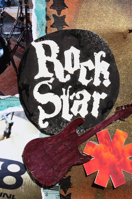 Well, when I dumped off the coloured chipboard “Rock Star” letters…I found I had used them as a mask and loved the effect!