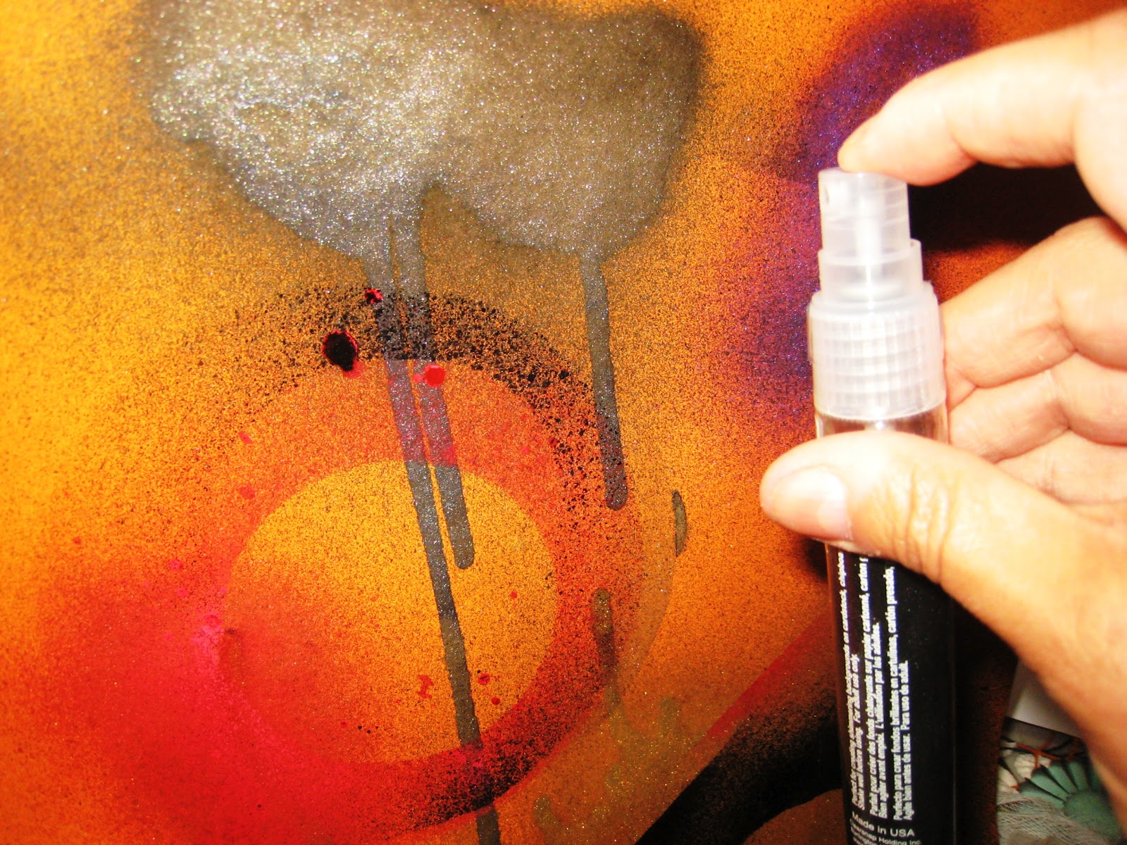 | I used Clearsnap Smooch Spritz to create these graffiti splotches and dripping effects (Cherry Ice, Black Velvet and Log Cabin) |