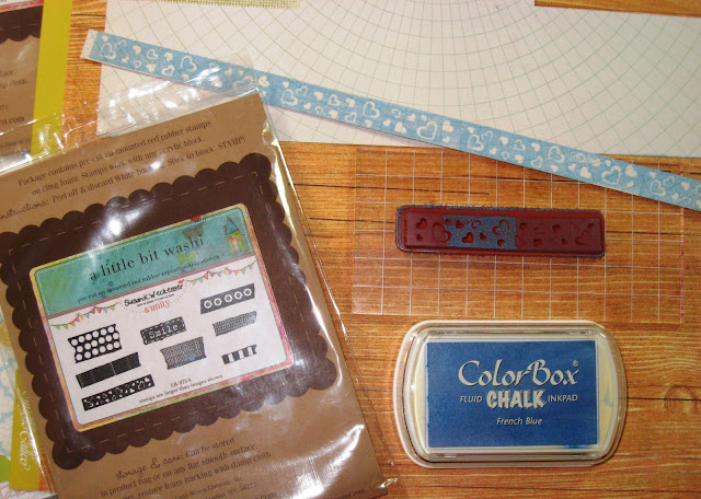 I stamped the banners with Clearsnap “French Blue” Fluid chalk ink onto the “Cubicle” patterned paper.