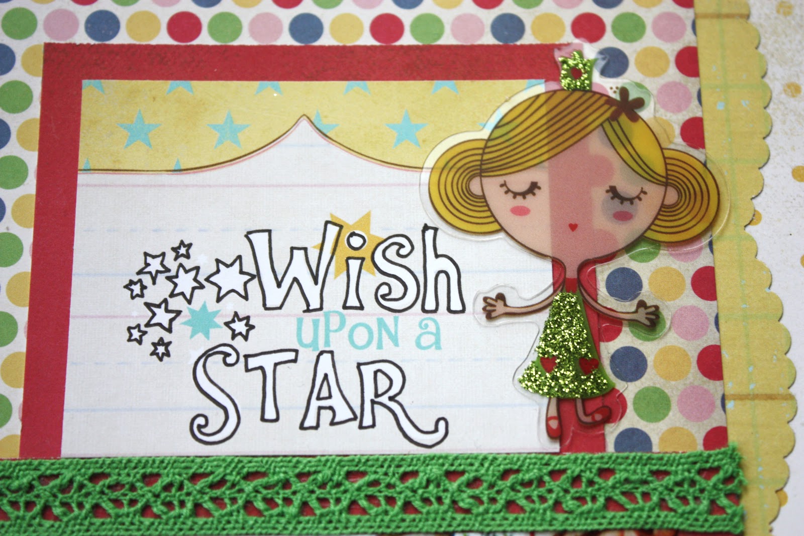 This collection comes with wonderful embellishments, which I used on my two layouts: ribbon, rub-ons, stickers, alphabet, and glitter cut-outs.