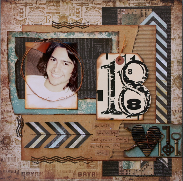 April 12, 2013 at 9:24 am (13 years ago)Kelly, this layout is amazing! The photos of your son show what a wonderful spirit he has and your layout captured that perfectly. I love the addition of the blue and the copper wire which highlight the neutral papers so well.